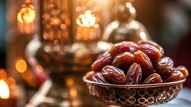 A bowl of dates with bokeh background, beautifully decorated for Ramadan month