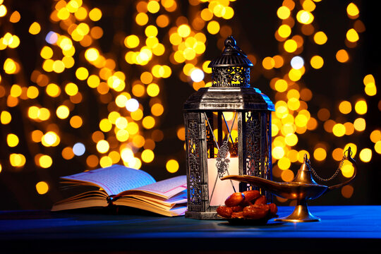 Arabic lantern, Quran, dates and Aladdin magic lamp on table against blurred lights at night