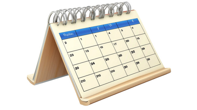 A desk calendar sits on a wooden stand, displaying the current month and dates