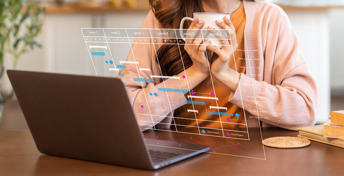 Human touching screen with calendar schedule time plan appointment, data management system, checking organizes day, week, month project list, business, calendar appointment plan concept