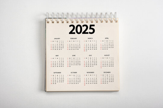 Calendar Year 2025 schedule. 2025 desk calendar notepad on white table and gray background. New Year. plans for 2025. background