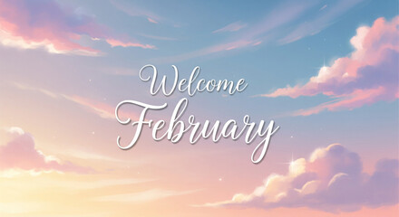 Welcome February Month Handwritten Text on Pastel Sky Sunset Background with Clouds