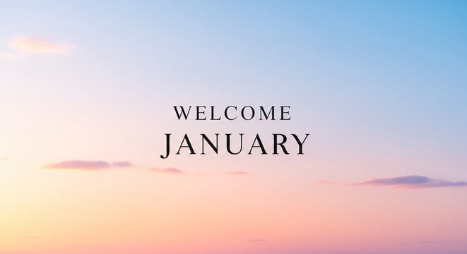 Welcome January text overlay on a soft pastel gradient sky with delicate clouds, gentle transition.