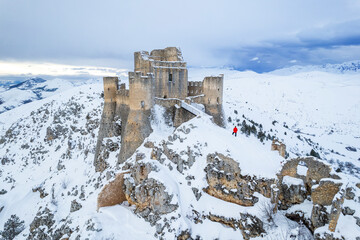 Man admiring the snowy medieval castle of Rocca Calascio after heavy snowfall, Rocca Calascio, Gran Sasso and Monti della Laga National Park, L'Aquila province, Abruzzo region, Apennines