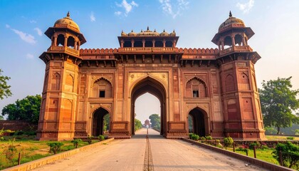 Monumental Red Sandstone Gateway with Elaborate Architecture under Clear Blue Sky near Agra India