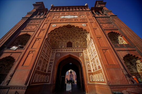 View of the monumental Badshahi Mosque gateway displaying intricate carvings and textures under a clear sky, Lahore, Lahore, Pakistan.