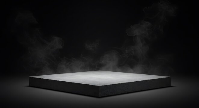Dramatic dark hexagonal podium with billowing white smoke and mist against an ominous black background