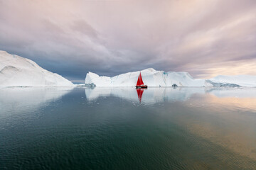 Reflection of a red sailing boat in front of a giant white iceberg with moody clouds in Ilulissat Icefjord in Greenland