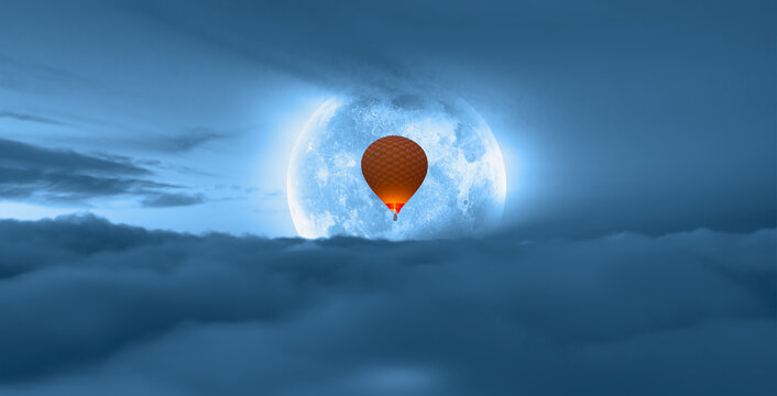 Orange hot air balloon is flying over the clouds with full moon "Elements of this image furnished by NASA"
