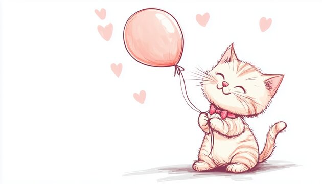 Sweet Pastel Doodle Of A Cute Cat Holding Balloon On A White Background: Artistic Drawing Of A Charming Feline With A Balloon.