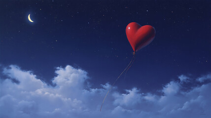 星のまたたく夜の雲海に赤いハート風船が月光に照らされて漂う情景