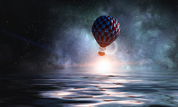 Hot air balloon flying before dawn against the moon and early dawn sky