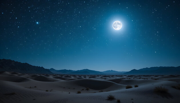 A full moon illuminates a vast desert landscape with sand dunes under a starry night sky, with distant mountains on the horizon.