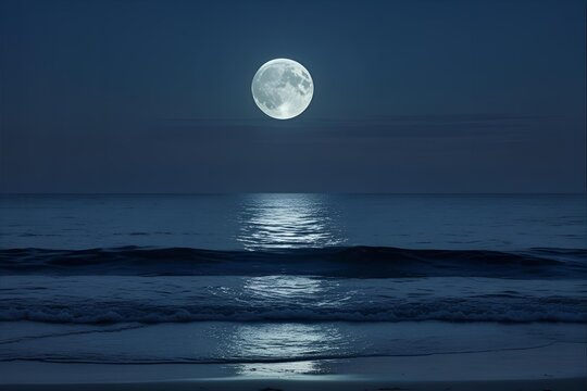 Full moon over a serene lake with silhouettes of trees and a starry sky.