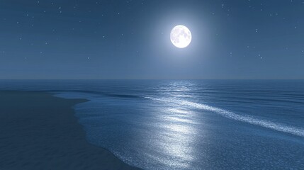 Blue moon light reflecting off ocean. Romantic twilight moonlight