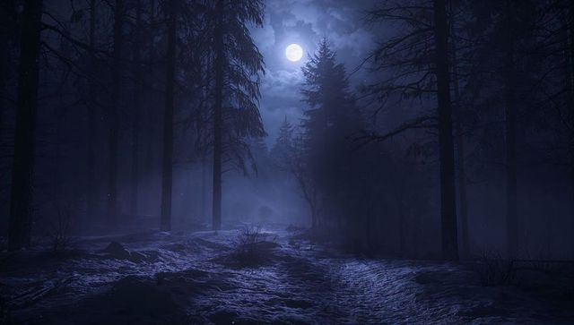 Moonlit snowy forest trail with mist, towering evergreens and haunting full moon