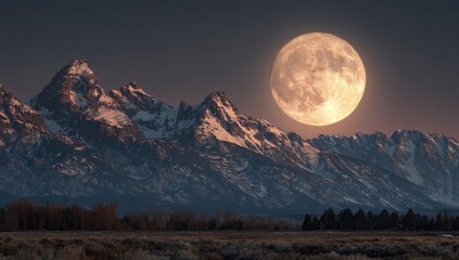 Full moonlit dusk over snow-capped mountain peaks