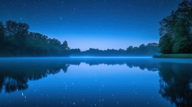 Moonlit city skyline with reflection on tranquil water
