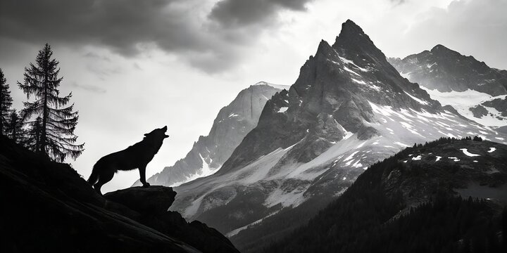Silhouette of a wolf howling at the moonlit mountains and stormy sky
