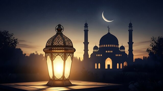 Moonlit Mosque Scene with Lantern at Dusk