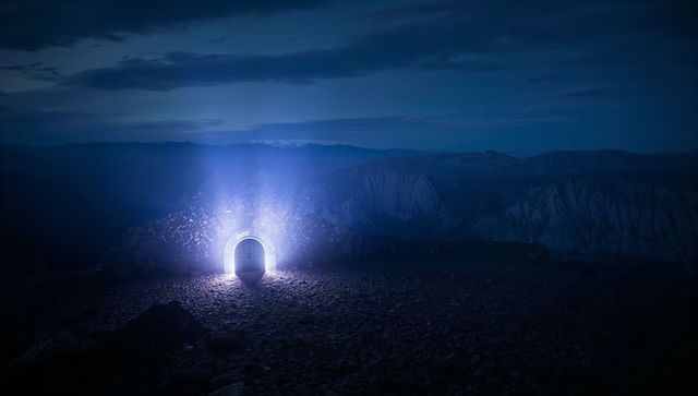 Epic moonlit gateway under starlit night sky