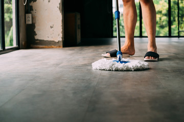Closeup on mop and wet floor at modern home in sunny day