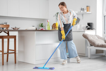 Woman, housewife mopping floor at home.