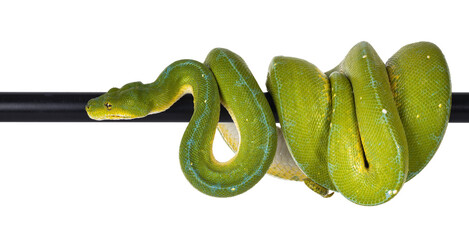 Adult Green Tree Python aka Morelia viridis hanging over black pole, moving to the side. Isolated cutout on transparent background.