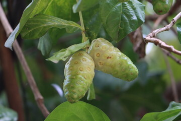 Close up of Noni fruits on the tree. Noni, or Morinda citrifolia, is a tree in the family Rubiaceae, or its fruit.