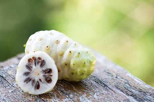 Noni fruit herbal medicines or fresh noni on tree. Raw Indian Mulberry fruit, Morinda Citrifolia.