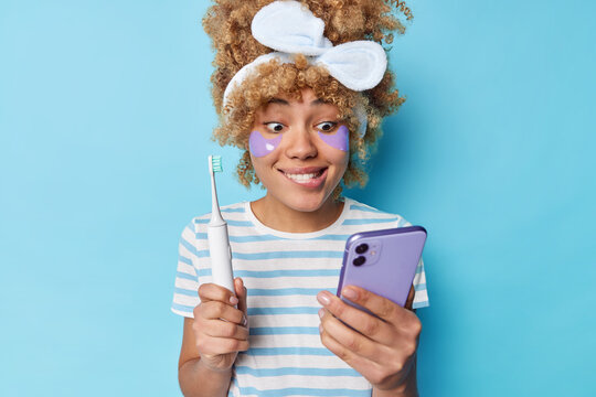 Positive young woman shows white teeth after cleaning takes care of skin applies bauty patches holds modern electric toothbrush and smartphone wears headband striped t shirt isolated on blue wall