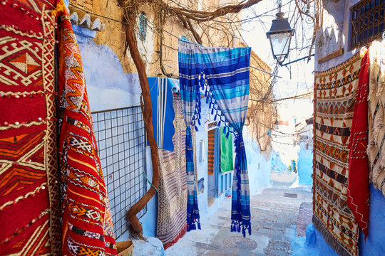 Cozy patio inside a blue house in medina of the blue city Chefchaouen, Morocco. Traditional moroccan architectural details.