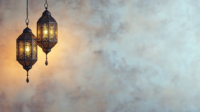 Illuminated Moroccan Lanterns Hanging Against Textured Wall