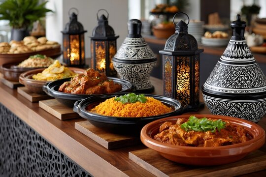 Traditional moroccan tajine dishes with couscous and lanterns displayed on wooden table