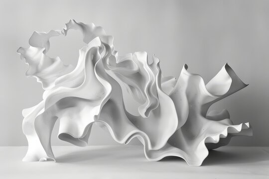 A white sculpture with organic shapes intertwining and creating a harmonious composition, Organic shapes morphing and intersecting in a harmonious dance of movement