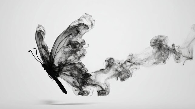 a butterfly comprised entirely of black smoke on a white background. The smoke is flowing up and morphing into the butterfly. It is wispy smoke, similar in shape to cigarette smoke, but black