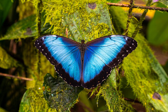 Close-up of a Morpho helenor, blue Morpho butterfly sitting on a leaf, Alajuela province, Costa Rica