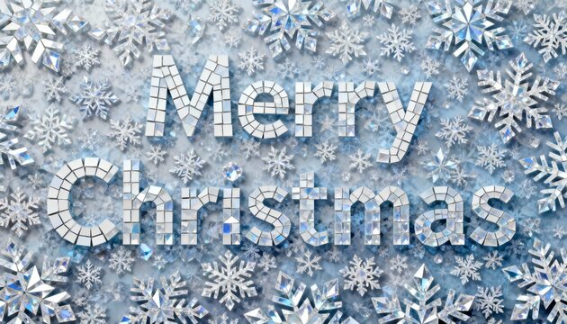 Mirrored mosaic merry christmas text with sparkling crystal snowflakes on icy blue