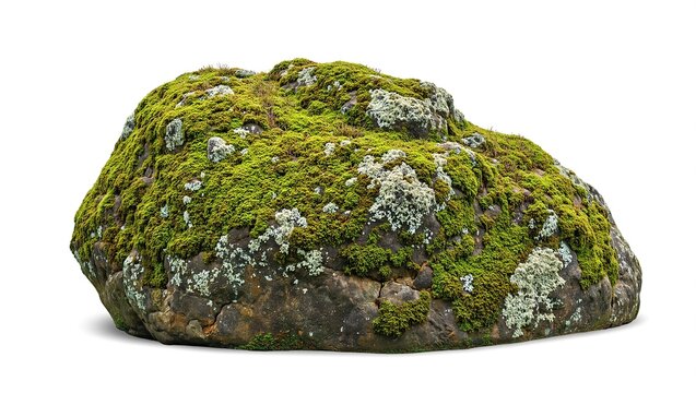 Tranquil moss covered boulder with lichen and cracks on a clean white background Ideal for nature and serenity concepts