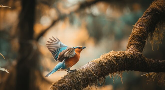 Colorful bird perched on mossy branch in forest setting with wings outstretched