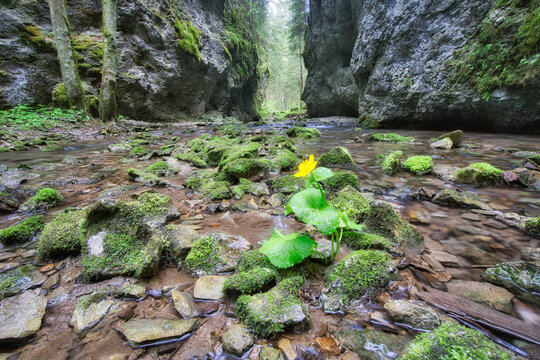 View of vibrant yellow flowers bravely blooming amidst moss-covered rocks in a stream-carved gorge, framed by towering cliffs, Hybicka Tiesnava, Zilinsky kraj, Slovakia.