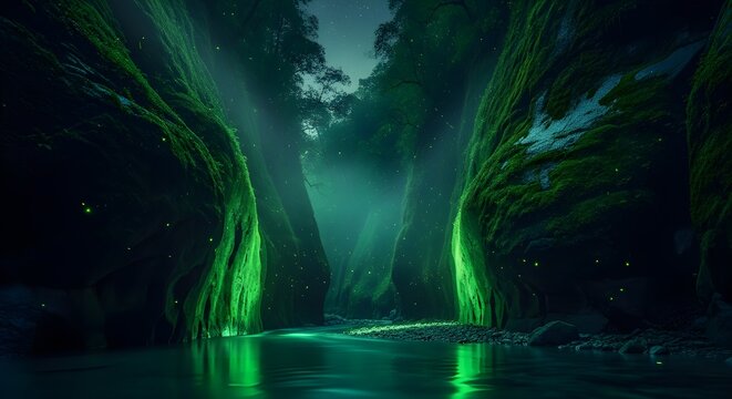 River flowing through canyon with mossy cliffs and sunset colors