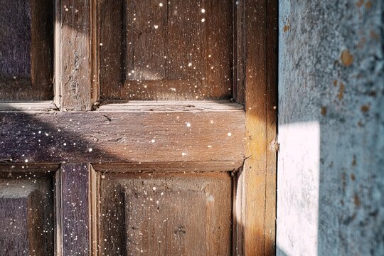 Rustic Wooden Door Detail with Sunlight and Dust Motes Creating a Dreamy and Textured Effect