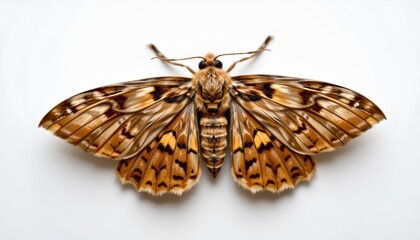 A large, brown and white moth with intricate patterns resting on a white surface. Its wings are spread out, showcasing its distinctive markings.