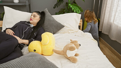 A woman rests on a bed while her daughter plays near a window in a cozy, well-lit bedroom.