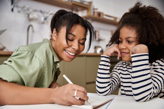 Mother and daughter sit at the kitchen table, engaged in drawing with colorful markers. They share a joyful moment, creating art together in a bright and inviting space.