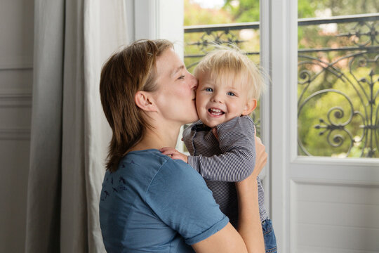 Smiling mother hugging toddler, sharing warm affectionate bond and joyful family portrait