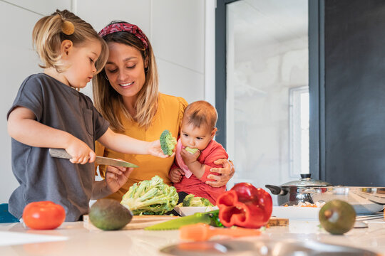 Mother holding baby girl while guiding daughter in cutting vegetables on kitchen island