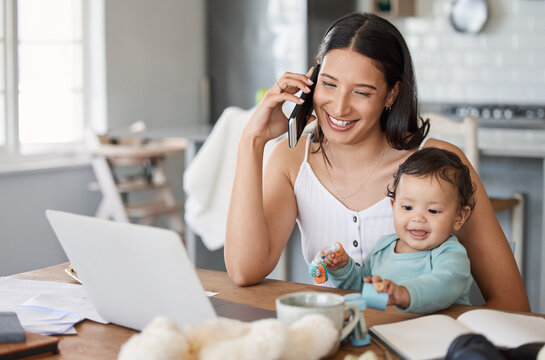 Laptop, baby or mother multitasking with phone call for remote work, freelance client or business in home. Smile, happy writer or mom juggling parenting task for responsibility, talking or daughter