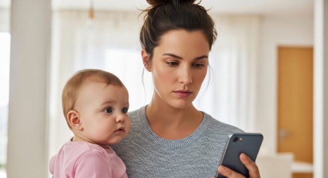 The Multitasking Mother: A devoted mother, expertly balances the demands of modern life, cradling her baby with one arm while managing a phone in the other.